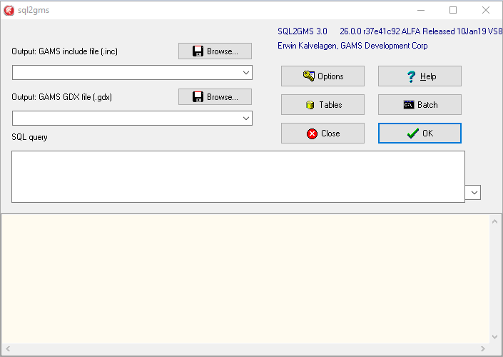 SQL2GMS is a tool to convert data from an SQL database into GAMS readable format. The source is any data source accessible through Microsoft's Data Access components including ADO, ODBC and OLEDB. The target is a GAMS Include File (.inc) or a GAMS GDX File (.gdx).