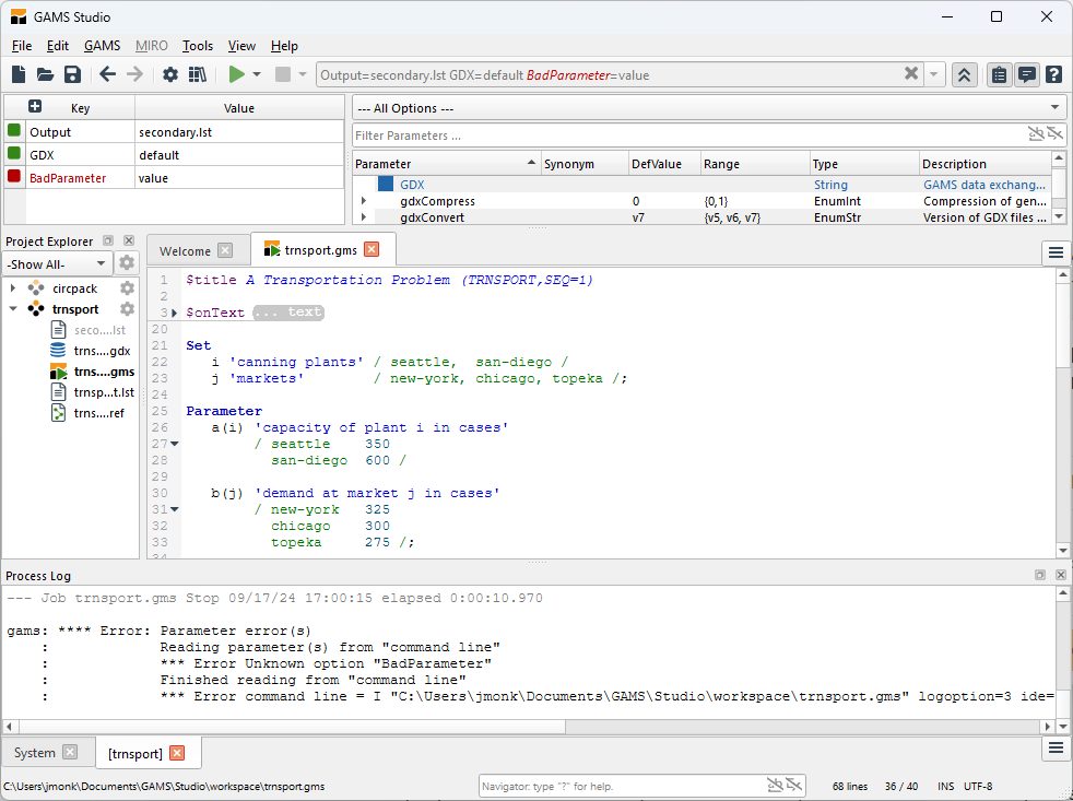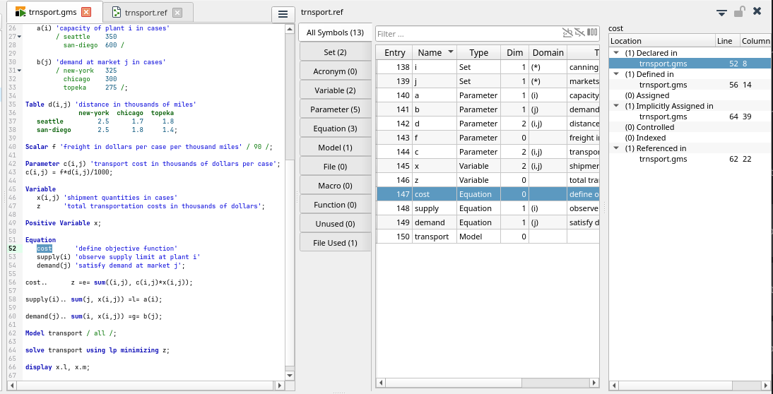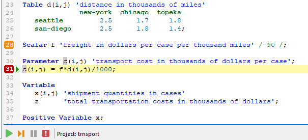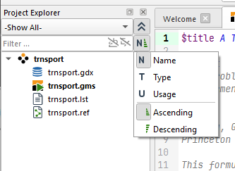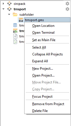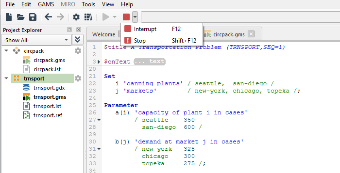 This is important to note: if you have a.gms and b.gms in a single project, and a.gms is set as the main file, pressing F9 while viewing b.gms will still run a.gms. To execute b.gms instead, you must first set it as the main file.