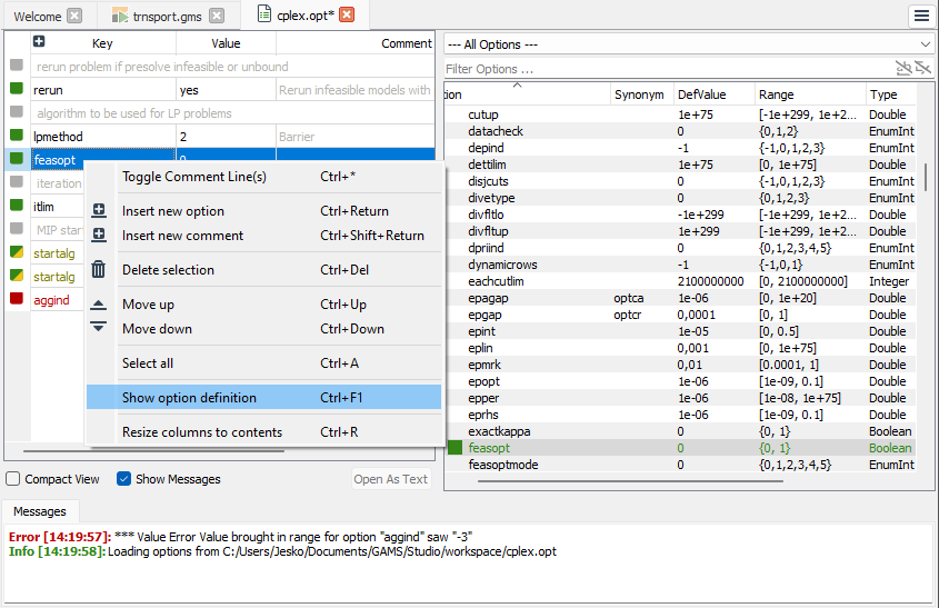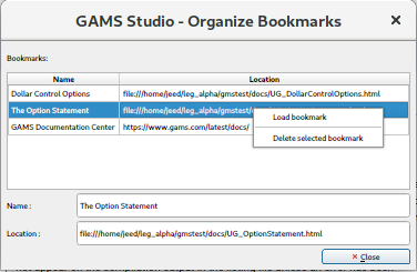 Code Editorallows to setbookmarksin text files opened in the main tabs. Bookmarks are kept when a tab is closed. When Studio is closed, the bookmarks are stored and restored when Studio is opened again. When a file is removed from Studio and doesn't appear in any project, the bookmarks for this file are deleted. A bookmark is placed at the current position in the active file using thetoggle bookmarkkey. Each line in the editor can hold only one bookmark; if a bookmark already exists on the line, it will be removed. The next/previous bookmark keys allow navigation through bookmarks across file boundaries. - Errors When a GAMS run results in errors, these errors are shown beneath the line number. Hovering with the mouse over the error shows details in a tooltip. The context menu opened with a right-click on the Line Number Area allows to clear all errors.
