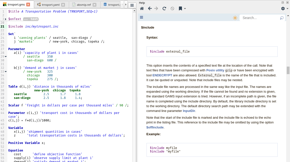 To navigate to files included in the GAMS source, hover over the file name and press Ctrl - Click or place the cursor at the filename and press F2. If found, Studio will add the file to the current project and open it. Only plain text filenames are detected this way; symbols are not resolved.