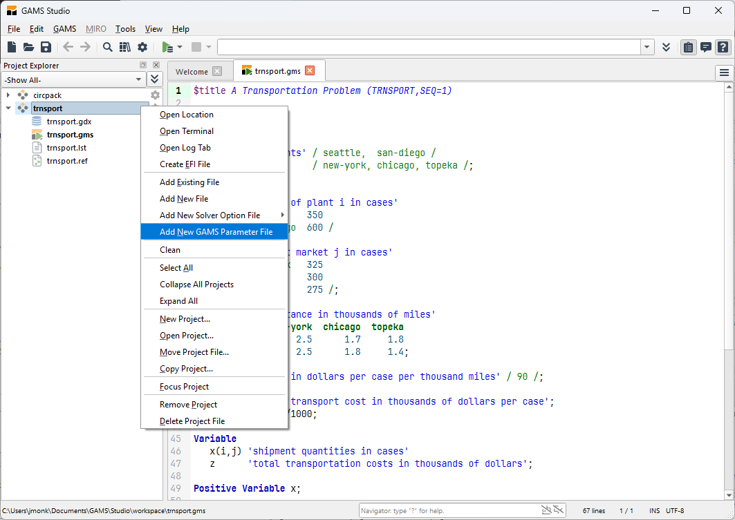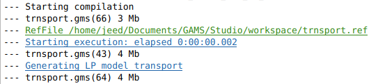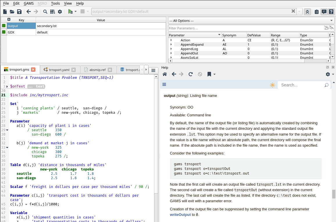 In the GAMSIDE, you always started by creating a "Project," which was essentially a pointer to the file system that defined a single working directory (i.e., it implicitly defined the workDir when starting GAMS). This directory was used to execute all the models added to the project, regardless of where the model files themselves were located. For example, if your project was in directory a, and you added models a/a.gms and b/b.gms, both files would be executed with a as the working directory. This meant all input data was expected in a (or relative to it), and all output files were also generated in a, not necessarily in the file's original location (like b).