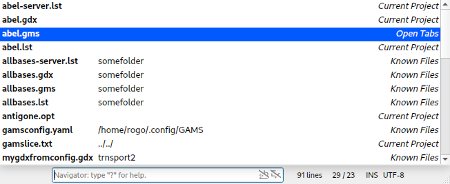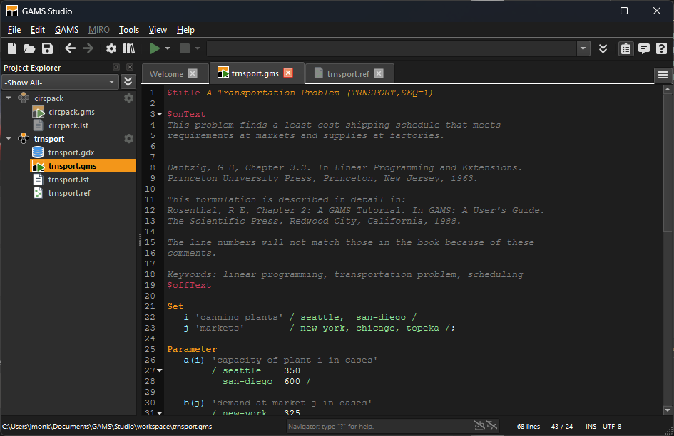 Another crucial difference is the concept of a "main file." While the GAMSIDE always executed the .gms file that was currently active in the editor, GAMS Studio executes the main file of the currently active project.