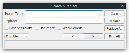 | Find | Ctrl - Shift - F | Command - Shift - F | Opens Search & Replace window, filling search field with selected text if there is any |