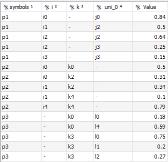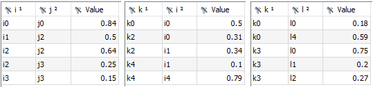 The CSVWriter automatically sorts the symbol records according to the categories (note that the order of column j was changed with the PythonCode agent) and therefore, the content of file ijk_out.csv looks as follows: