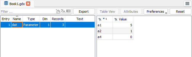 This will try to load set elements from the GDX parameter symbol adata into the set i and next load the GDX parameter adata into the GAMS parameter a. The latter one is no problem anymore, since the data for set i is known when loading symbol a. GAMS will use the domain information stored in GDX of parameter adata to identify the index position to project on. If no appropriate domain information can be found in GDX, the GAMS compiler will generate an error. In such case the user can explicitly select an index position (here first index position) from the GDX symbol: