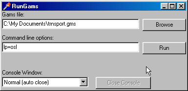 Another issue that needs to be addressed is that GAMS needs a place to put its scratch files. By default this is the current directory, a concept that is not always clear in a windowing environment. A good way of dealing with his is to set both the current drive and the current directory before running the GAMS job. It should be noted that GAMS needs write permission there. In the examples we use the Windows TEMP directory for this, but in a real application you may want to use a designated directory. The Windows TEMP directory is found by calling the API function GetTempPath.