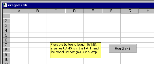This very simple example shows how GAMS can be invoked from an Excel spreadsheet. The "example spreadsheet" has a button, which will cause GAMS to run the trnsport.gms model stored in c:/tmp. There is no data exchange.