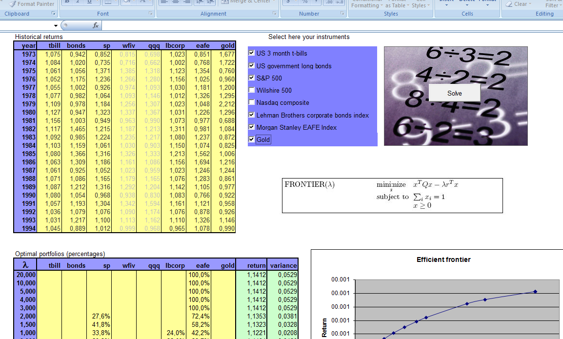 This example solves a series of NLPs to create an efficient frontier of a portfolio optimization problem. It comes with the GAMS distribution in apifiles/VBA/portfolio.xlsm.