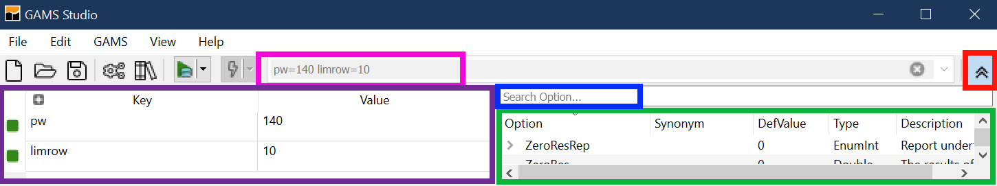Once it opens the general format of the solve option editor is as follows. Note the specific content depends on the solver chosen and in this case I use GAMSCHK.