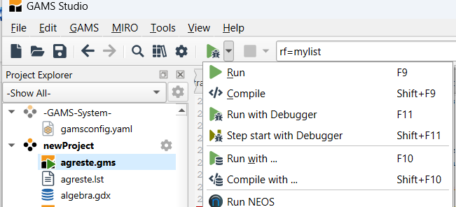 Then to run and get the GDX file one initiates a run with the Run with Debugger or F11 choice: