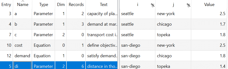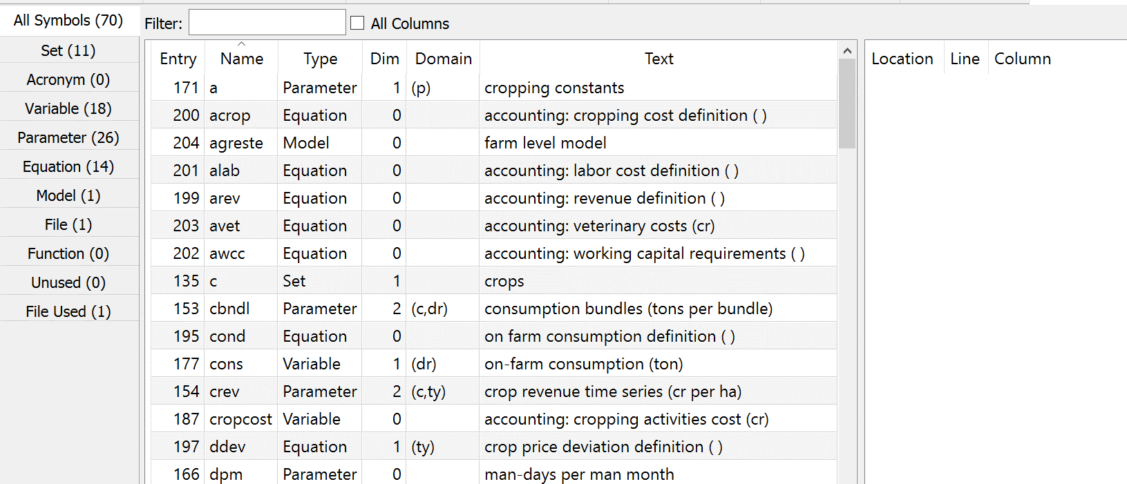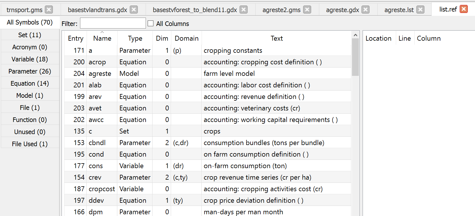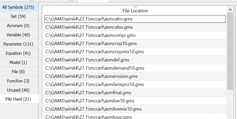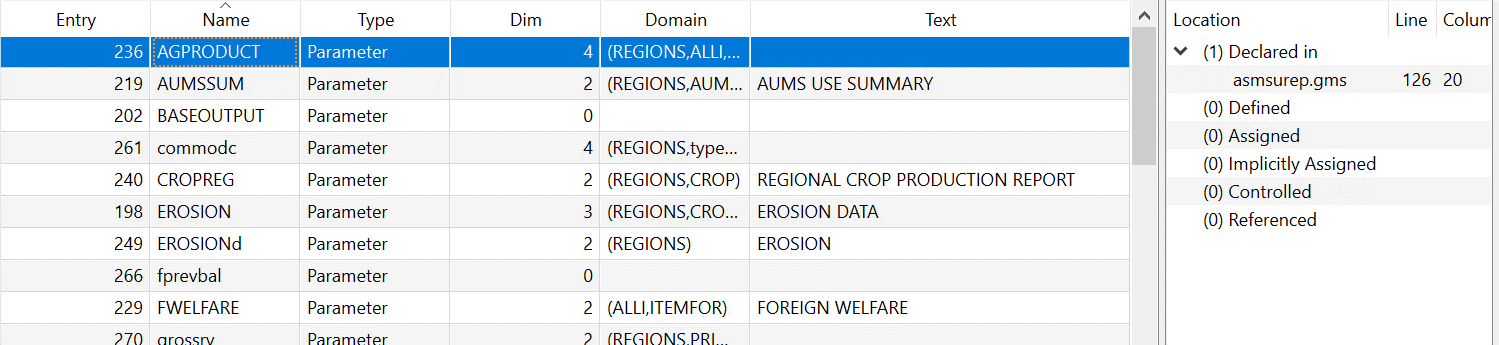 | Declared | places where the named item is declared in a Set, Parameter, Table, Scalar, Variable, Equation, Acronym, File or Model command. This will be the first appearance. |