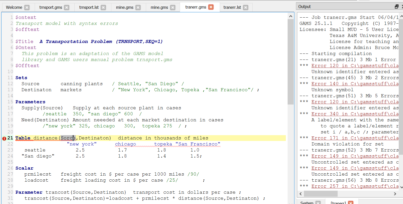 A quite new feature of STUDIO is the debugger. With the debugger one can specify a line to run to in the code then run up to that point and suspend execution and get a program generated GDX file of all the data items as of the start of that statement. One can then examine all the data and either