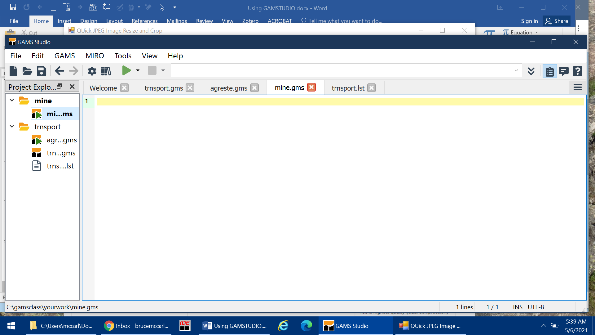First, one uses a text editor and creates a file which contains GAMS instructions.