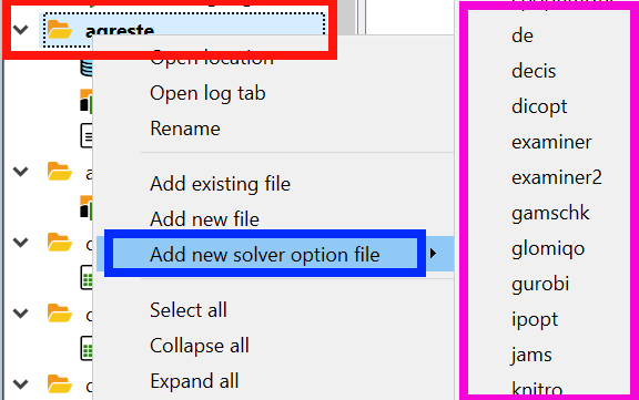 - Right-clicking on a group file name (red) in the Studio Explorer then selecting add new solver option file (blue) and subsequently selecting one of the many available solver names (magenta and only a few shown). This will create a file you then need to save.