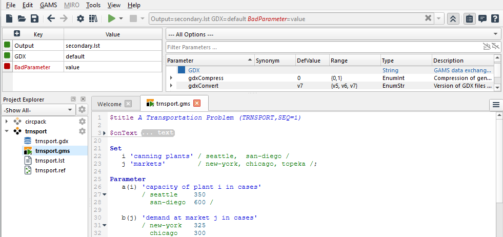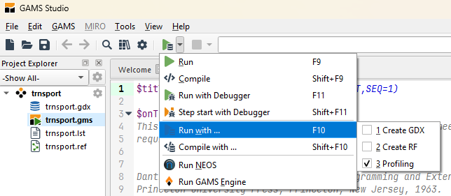 This is important to note: if you have a.gms and b.gms in a single project, and a.gms is set as the main file, pressing F9 while viewing b.gms will still run a.gms. To execute b.gms instead, you must first set it as the main file.