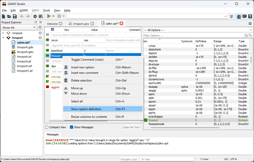 Code Editorallows to setbookmarksin text files opened in the main tabs. Bookmarks are kept when a tab is closed. When Studio is closed, the bookmarks are stored and restored when Studio is opened again. When a file is removed from Studio and doesn't appear in any project, the bookmarks for this file are deleted. A bookmark is placed at the current position in the active file using thetoggle bookmarkkey. Each line in the editor can hold only one bookmark; if a bookmark already exists on the line, it will be removed. The next/previous bookmark keys allow navigation through bookmarks across file boundaries. - Errors When a GAMS run results in errors, these errors are shown beneath the line number. Hovering with the mouse over the error shows details in a tooltip. The context menu opened with a right-click on the Line Number Area allows to clear all errors.