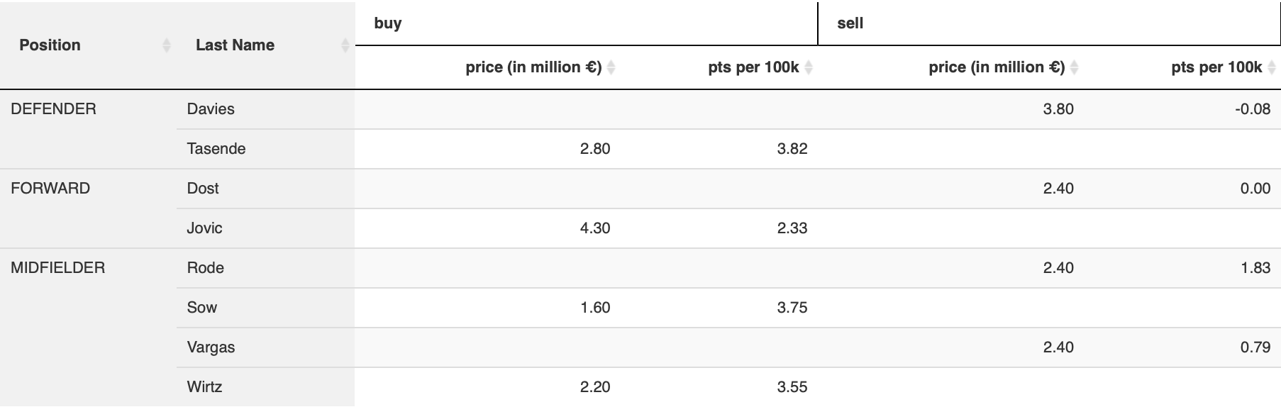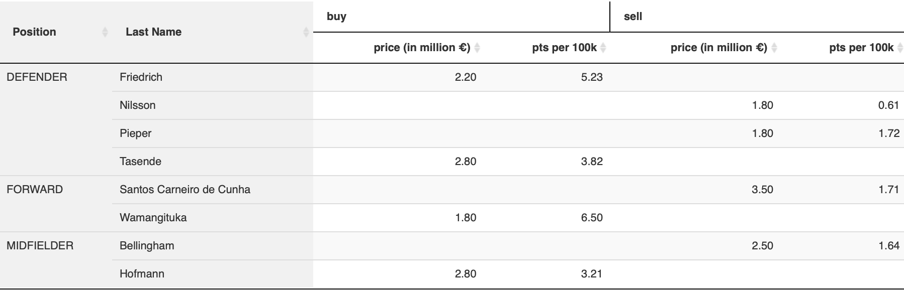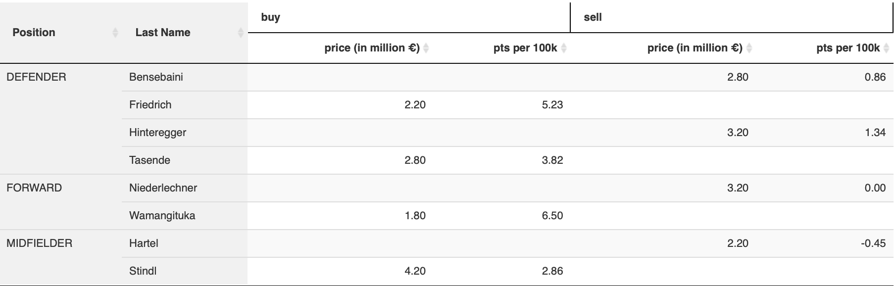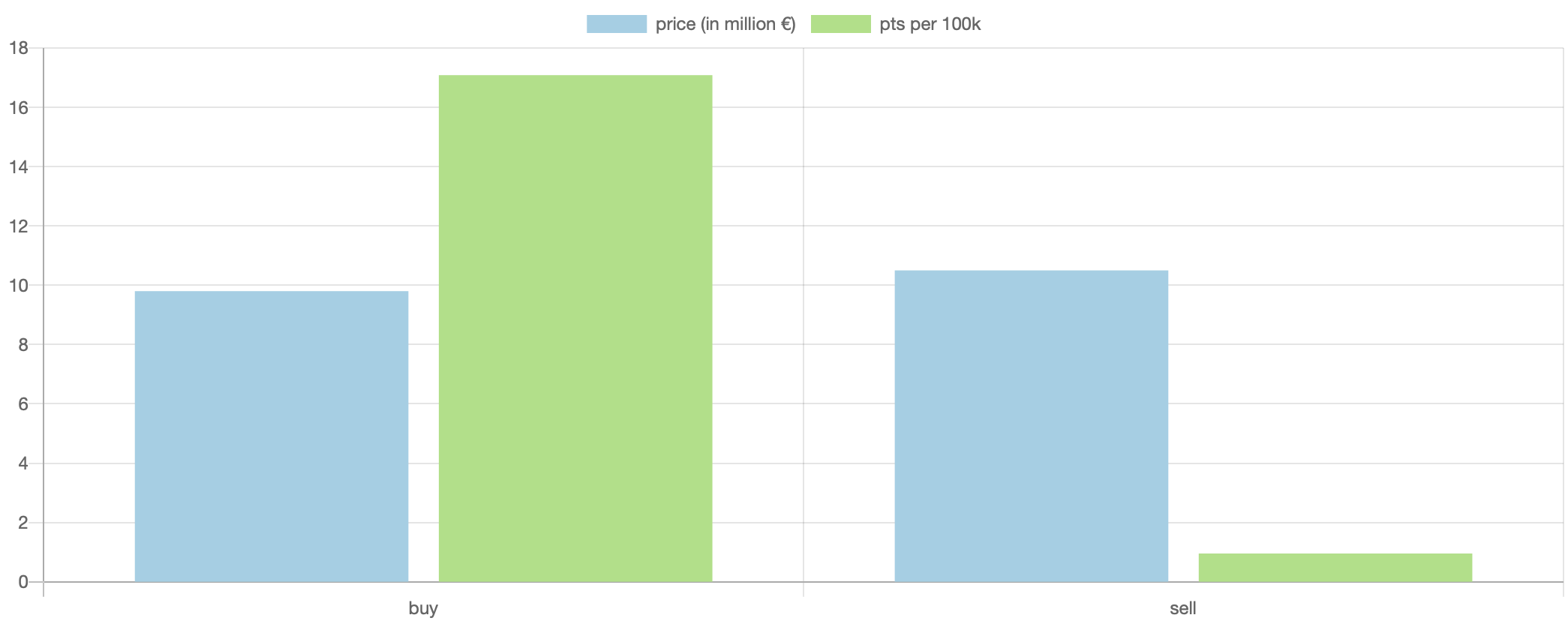 Note that the total price of sold players is slightly higher than that of purchased players, but the points/100,000€ are much higher for purchased players than for those that are sold.