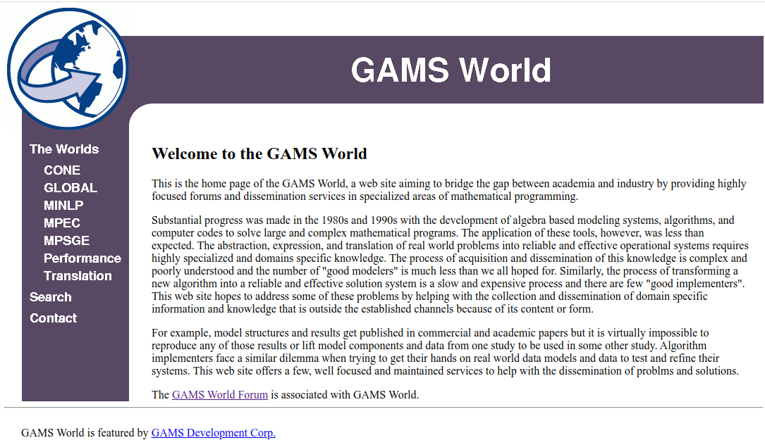 In the ever-evolving landscape of the internet, websites come and go, reflecting the changing needs and priorities of their users. After two decades of serving as a hub for mathematical programming enthusiasts, the time has come to bid adieu to GAMS World . Founded with the noble vision of bridging the gap between academia and industry, this website made significant contributions in its prime, fostering the exchange of specialized knowledge and promoting collaboration. In this article, we reminisce about the purpose and achievements of GAMS World, explore its impact on the field of mathematical optimization, and understand the reasons behind its decommissioning.