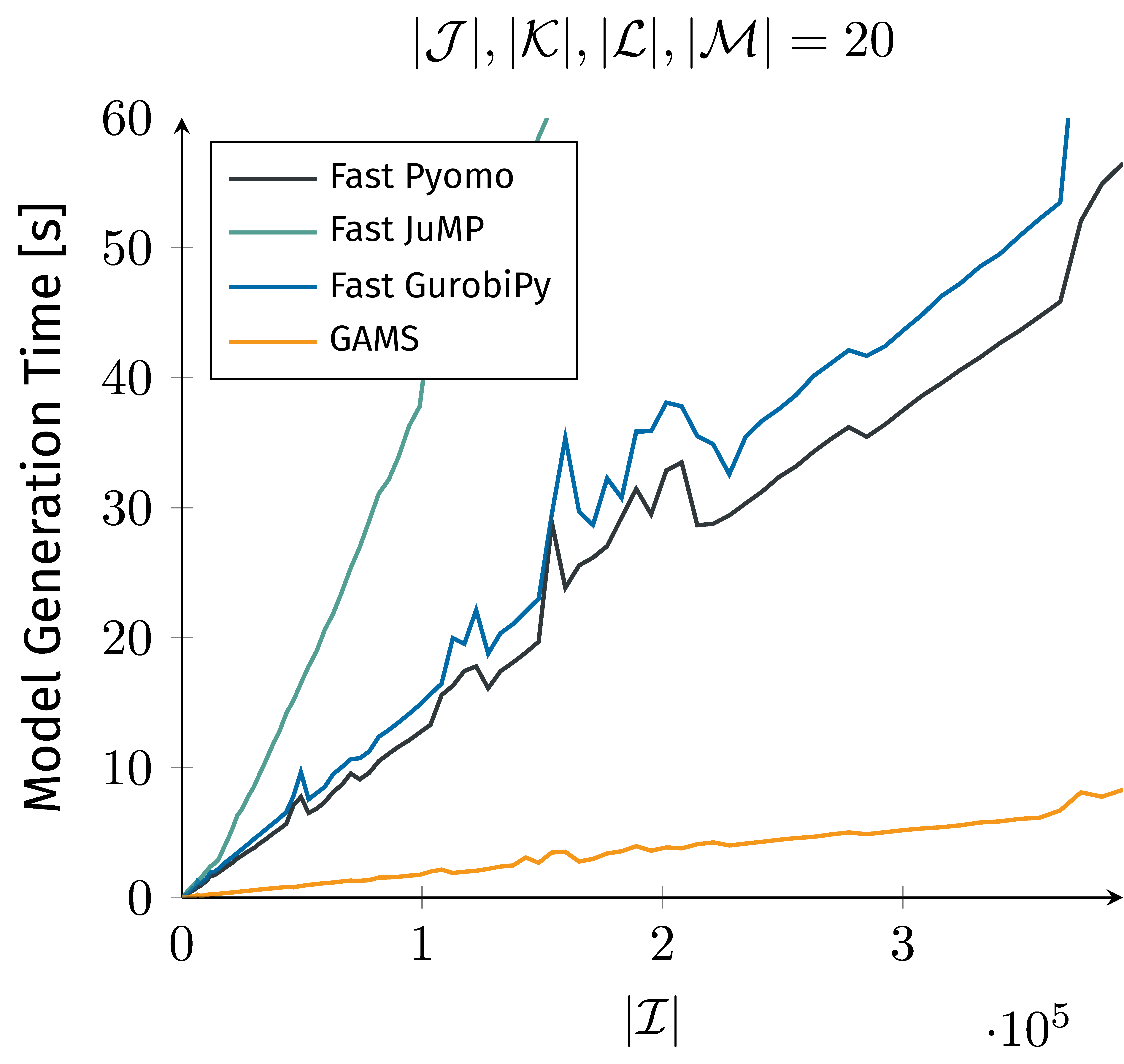 Other recent research also focuses on efficiency of model generation. The paper Linopy: Linear optimization with n-dimensional labeled variables1 compares some open source modeling frameworks but unfortunately chose a dense model (the knapsack problem) as a benchmark problem. In our experience dense models are extremely rare in practice and don’t really represent a challenge with respect to model generation. The ongoing study Computational Performance of Algebraic Modeling Languages Under Practical Use Cases at Carnegie Mellon University2 also analyzes different modeling frameworks with an emphasis on model generation performance.