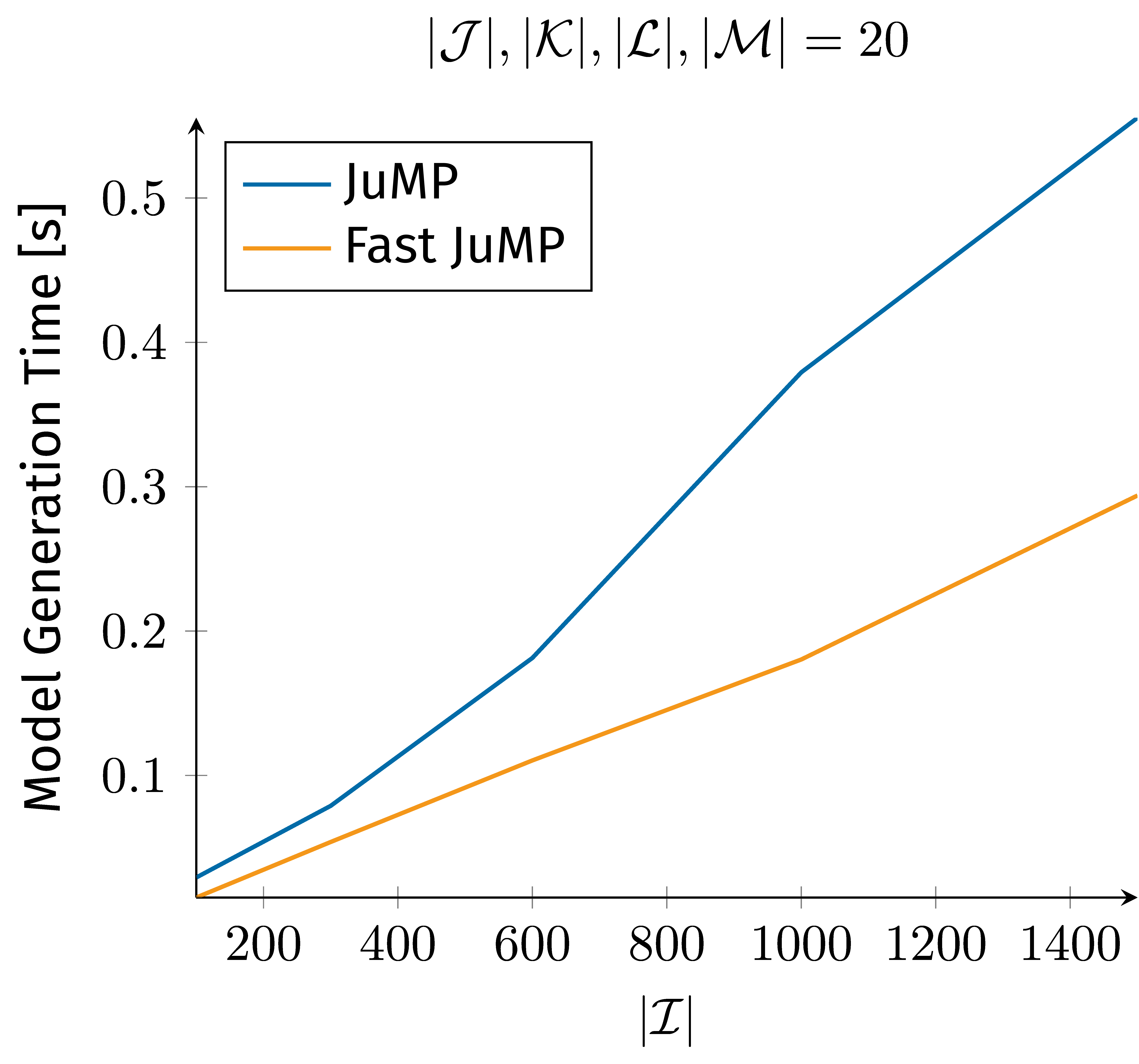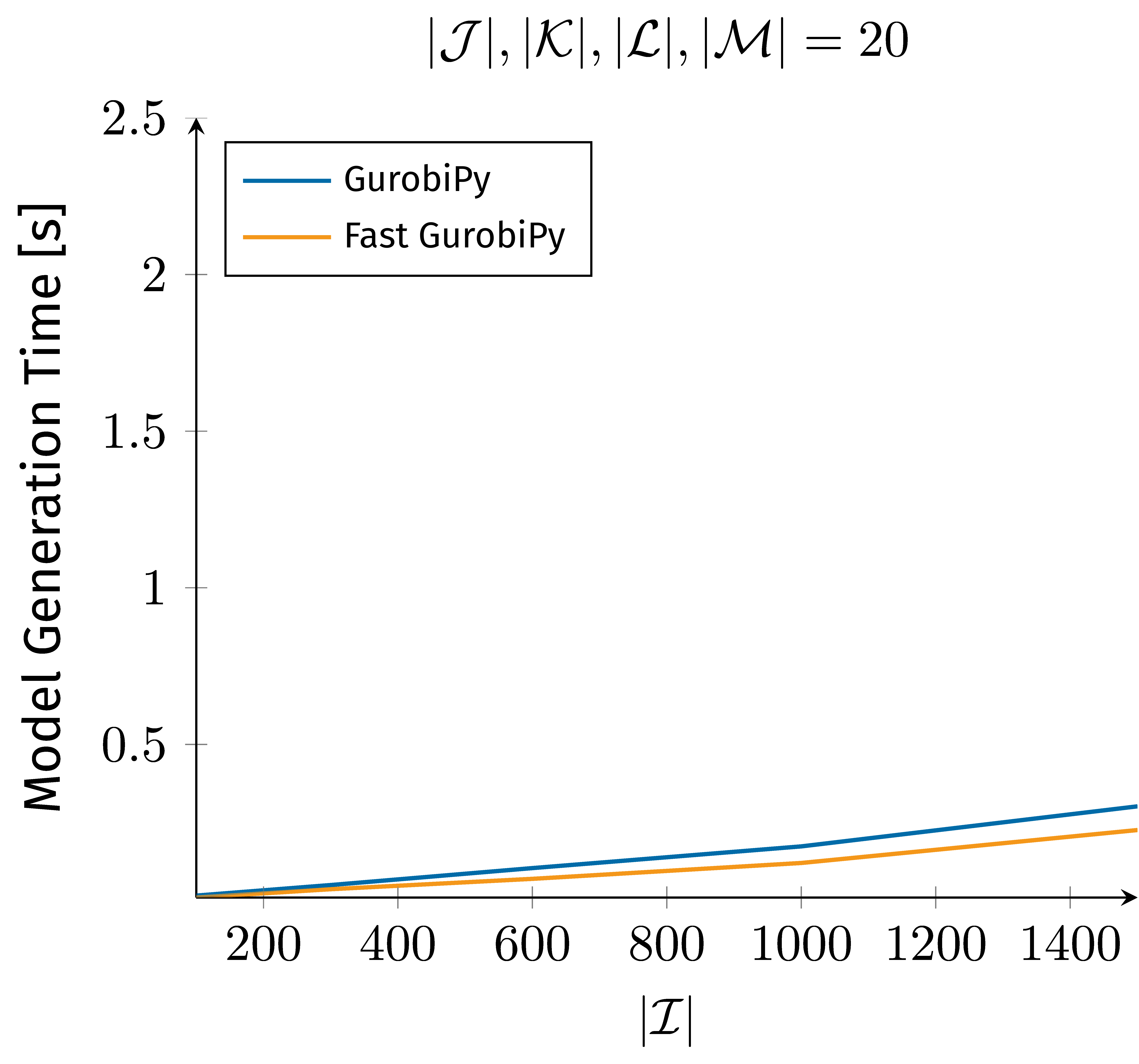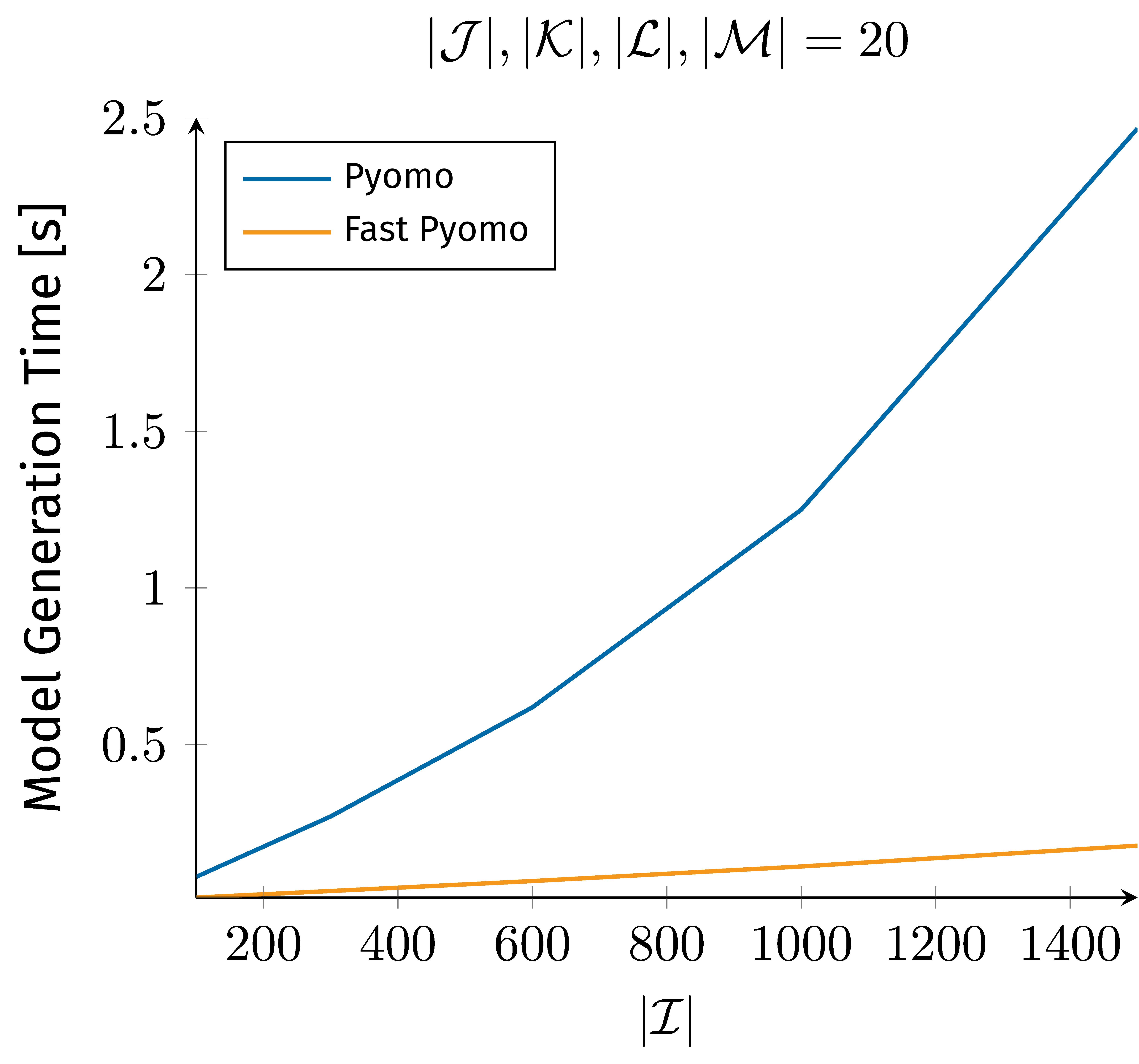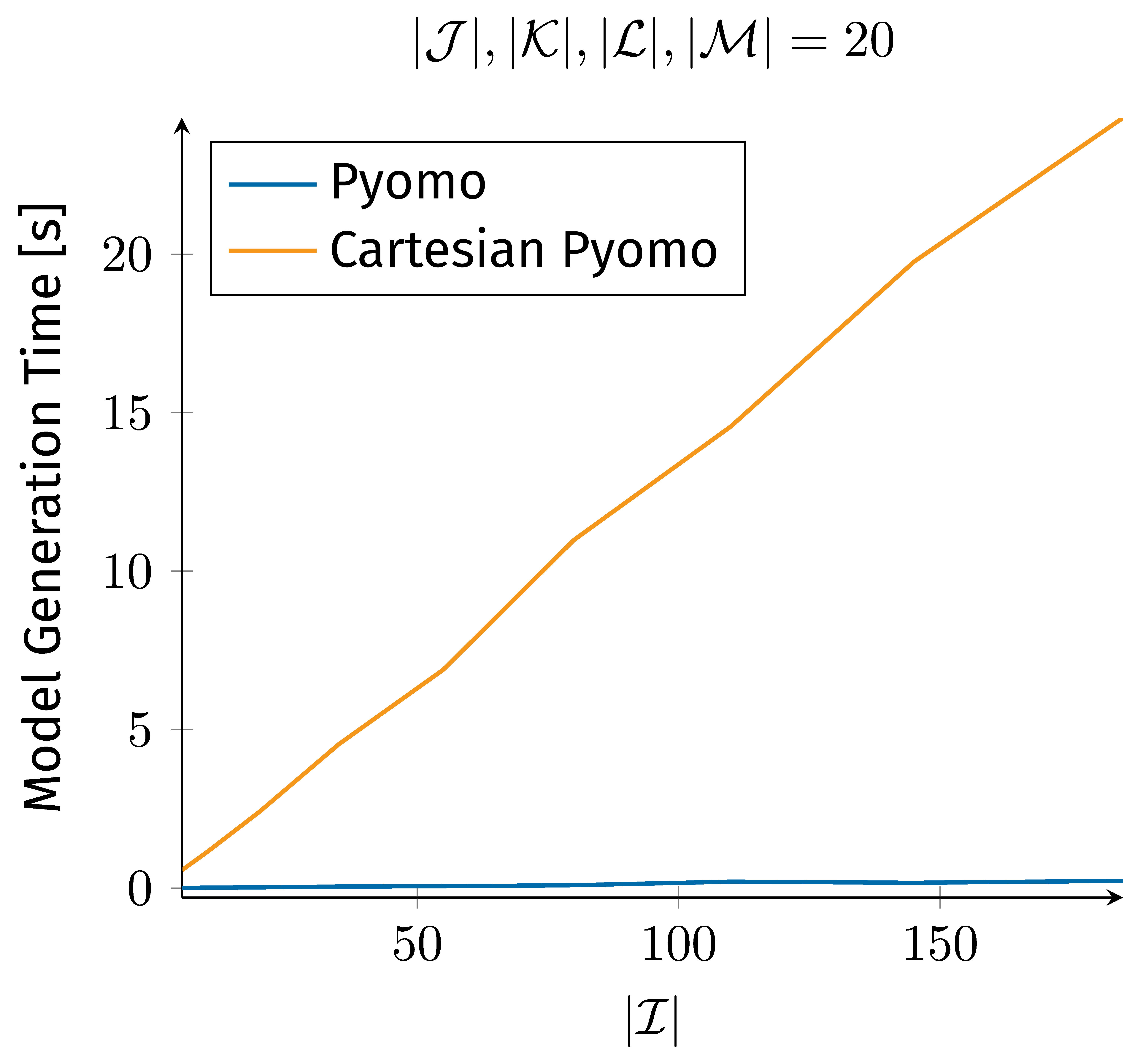 Figure 1 presents the time required to generate a model instance for the exemplary mathematical model with Pyomo, as a function of problem size, specifically the growing size of set $\mathcal{I}$. The figure demonstrates the model generation time for an implementation of the model where all variables are defined as the Cartesian product of all indices without carefully defining only the relevant variables. In contrast, Figure 1 also presents the model generation time for an implementation where only relevant variables are carefully defined. We report the minimum model generation time across multiple runs for every problem size data point. Comparing the model generation time for the two implementations emphasizes the importance of precise variable definition in mathematical optimization. The model generation time for the Cartesian product implementation increases drastically with problem size, while the carefully defined variable implementation maintains a moderate model generation time.