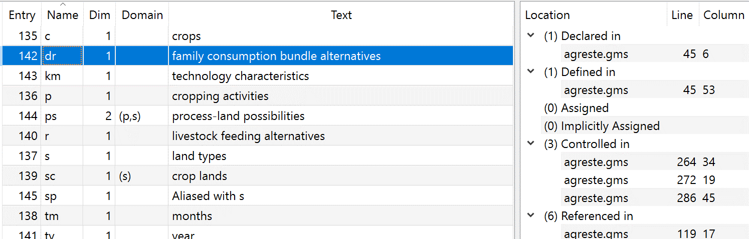 | Declared | places where the named item is declared in a Set, Parameter, Table, Scalar, Variable, Equation, Acronym, File or Model command. This will be the first appearance. |