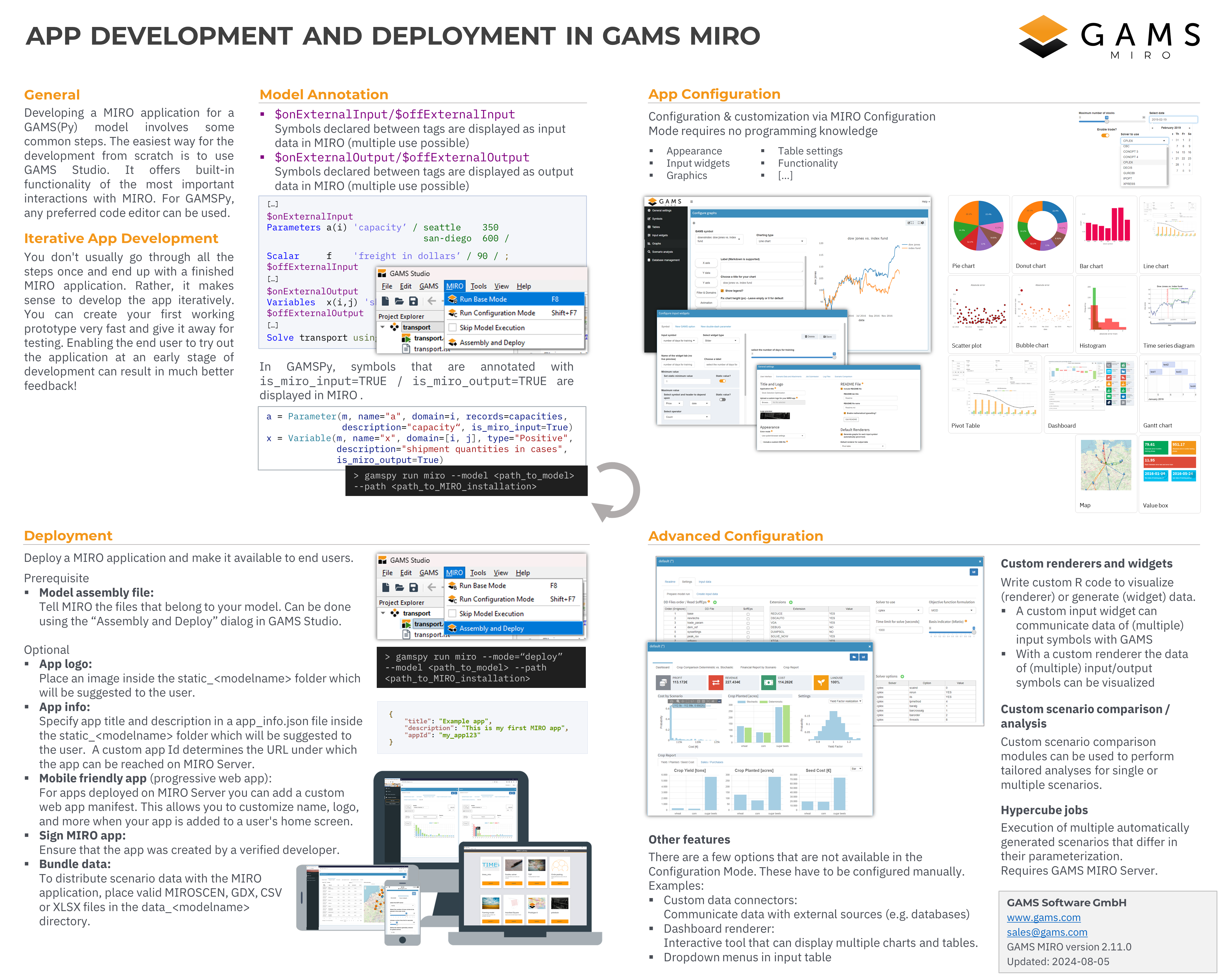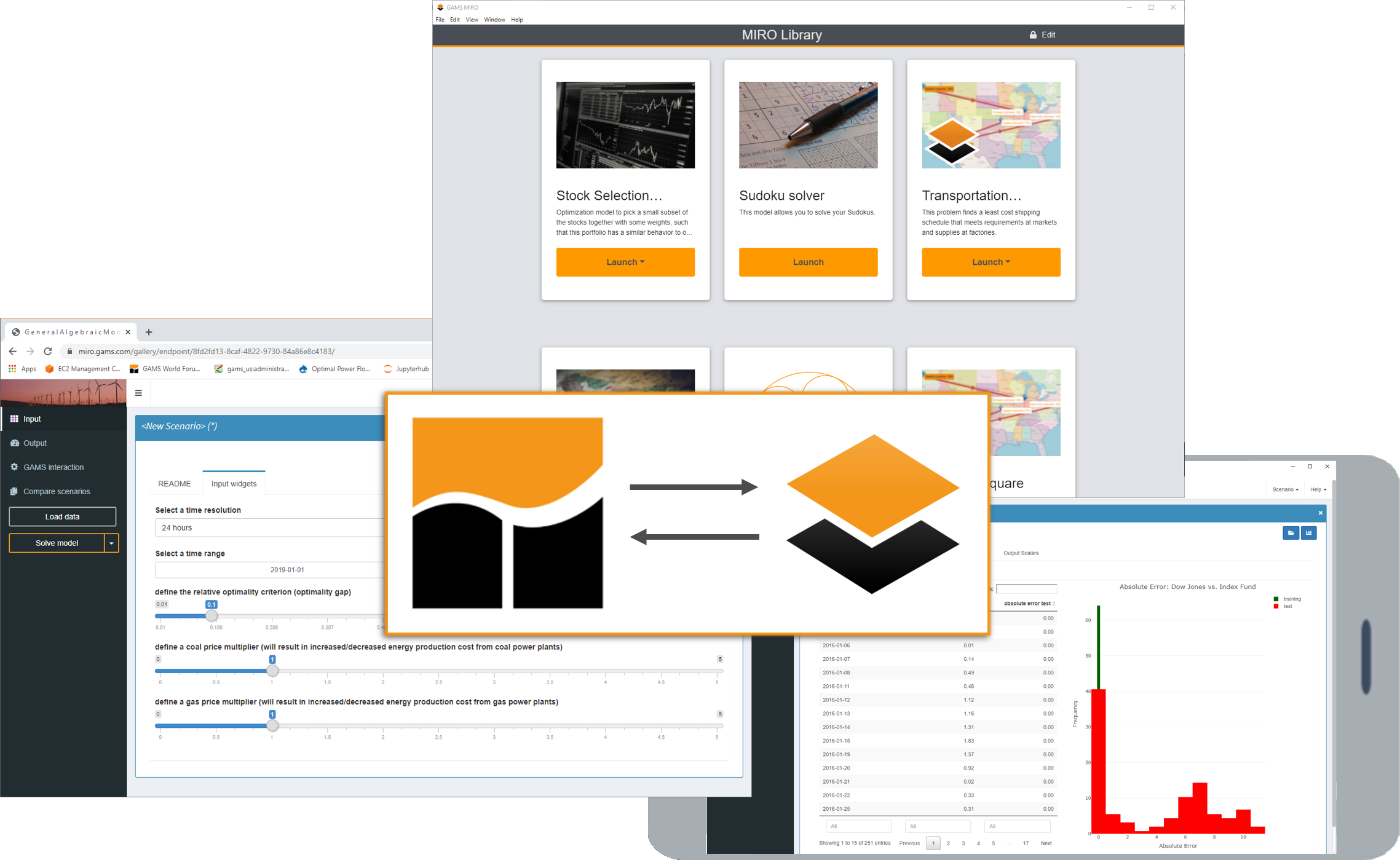 GAMS MIRO is a deployment environment which allows you to easily turn your GAMS and GAMSPy models into fully interactive applications. MIRO is designed for people looking for an easy and automated way to make their models available to end users. Extensive visualization options support you to make decisions based on optimization. State-of-the-art technology makes it possible to run in highly scalable cloud environments.