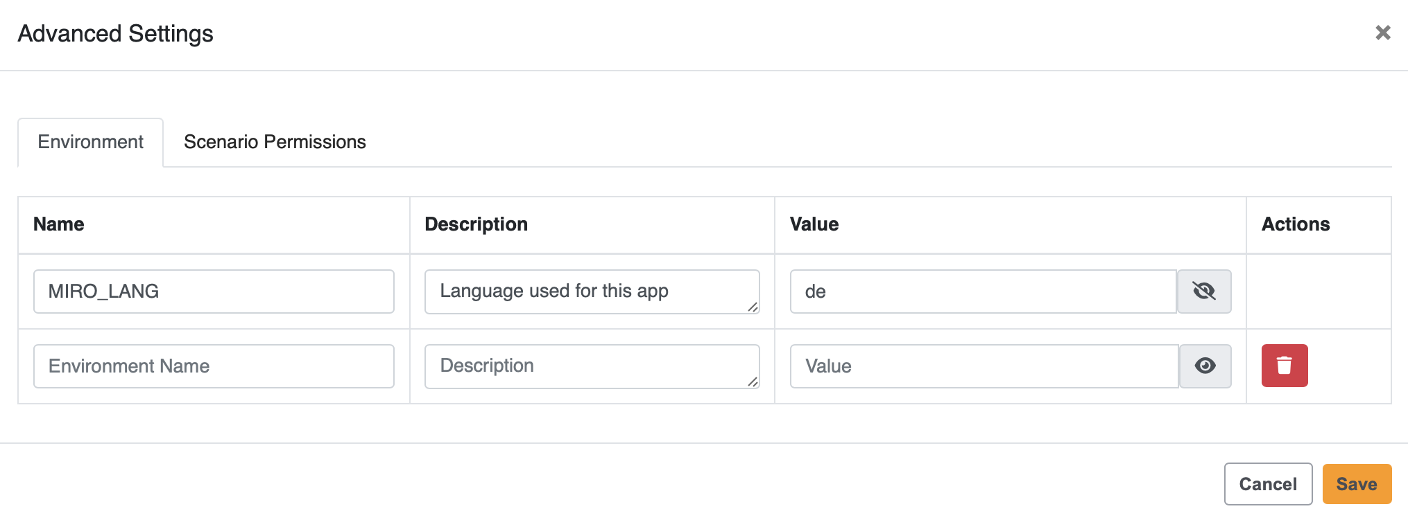 Clicking this button opens a dialog where you can configure advanced options, such as environment variables or default scenario permissions. Environment variables are especially useful if your app includes custom R code, such as custom data connectors or custom renderers, that require secrets like API keys to connect to external systems.