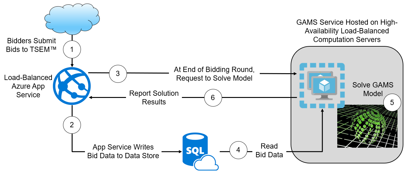 CRA’s algorithm is a component of CRA’s trading platform, Trading System for Efficient Markets (TSEM™). In addition to its use for CRA’s GDT trading event auctions, TSEM™ also is applicable for other CRA clients and industries. The following is an overview of how CRA’s algorithm and models are integrated into the IT ecosystem of CRA’s TSEM™ trading platform.