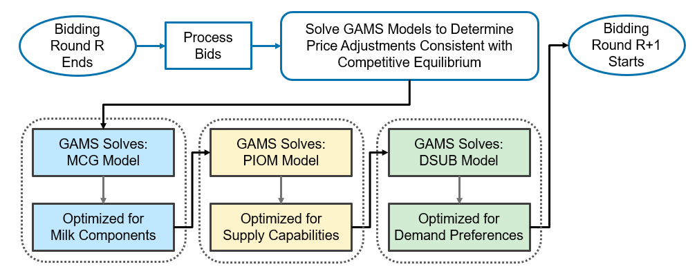 Then GAMS solves a series of models. First, an optimal solution is found for the “Milk Components Group” model, and this result is used as input for the “Price Increment Optimization” model, for which an optimal solution is found, and this result is used as input for the “Demand-side Substitutability” model, for which an optimal solution is found. The result is a vector of price increments and prices to support the simultaneous multiple-round ascending-price clock auction process to achieve competitive equilibrium prices for all products and contracts simultaneously and quickly over a series of bidding rounds. The efficient price discovery mechanism supports, and is reflective of, each seller’s manufacturing capabilities and costs, and each buyer’s preferences over substitutable products (via price arbitrage) and complementary products (via preferred portfolios and combinations).