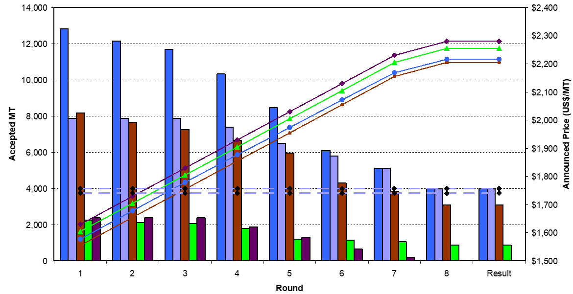 As prices (solid lines) increase, demand (height of vertical bars) falls, until a bidding round is reached (in this case, round 8) when demand (height of vertical bars) falls within the supply range (dashed horizontal lines) – i.e., convergence to competitive supply-demand equilibrium. Different colors refer to different product specs (grades) within the same product group or sales group – there are constraints and optimization at multiple, interdependent levels of supply simultaneously given the supply-demand structure. This chart shows only a small subset of the approx 100 different products.