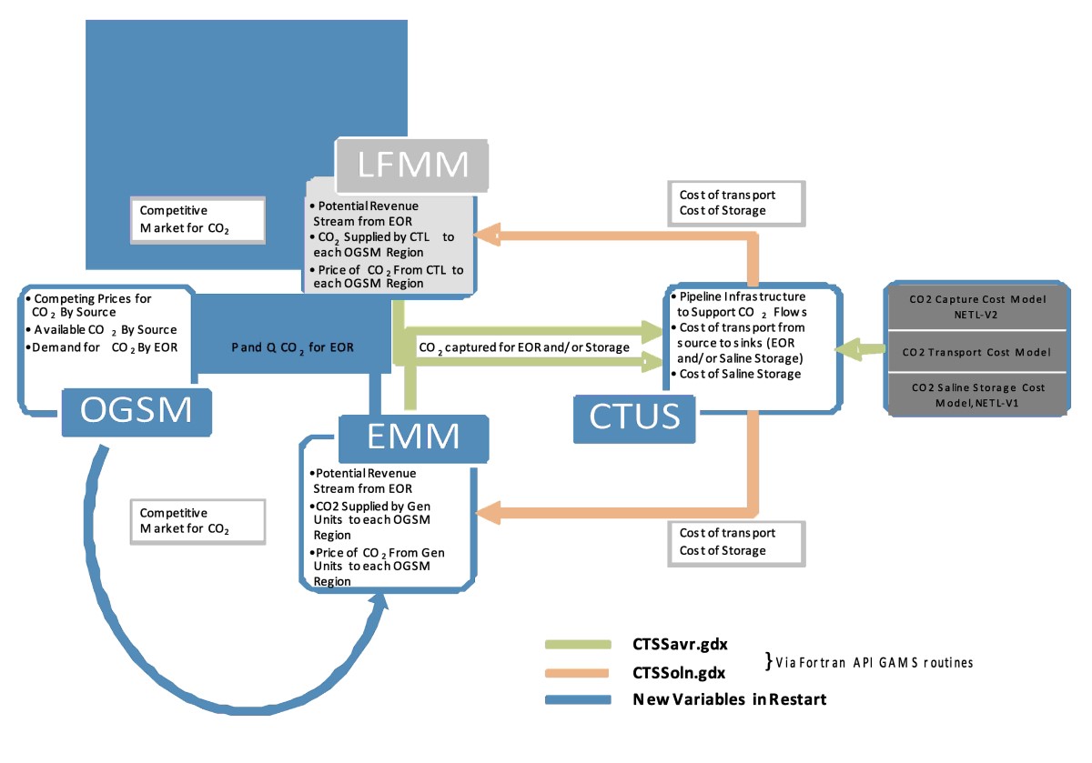 The U.S. Department of Energy uses GAMS to analyze potential CO2 emission reduction scenarios in which CCS may play a role in meeting emission goals. The NETL CO2 Capture, Transport, Utilization and Storage (CTUS) model developed by the DOE National Energy Technology Laboratory is written in GAMS. It optimizes by minimizing the cost of the transport and storage network, via a mixed integer program (MIP), evaluating potential networks of CO2 pipelines and storage infrastructure amenable to handling the transport and storage of captured CO2 from the CCS enabled electricity sector. This type of problem was particularly well-suited for GAMS due to the volume of data processed, the solution methodology, the ability to integrate with other modeling platforms, and the stringent requirements for solve time required of this capability in order to eventually integrate into more holistic energy-economy models.