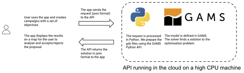 The VIOOH platform is composed of microservices. The UI and the backend application is in a common language (Javascript & Java). The optimization program is encapsulated in a Python API. The API receives all the campaign data (duration, eligible inventory, etc.) from the front-end application in a JSON format. The data preparation and creation of the GDX files are performed using the GAMS Python API. The optimization program is written in a GAMS file