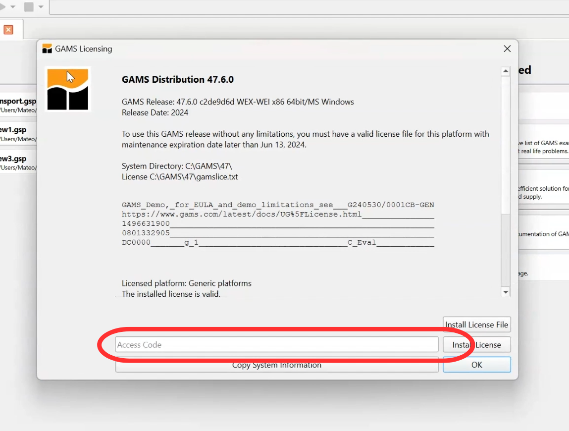 Your new Community License should be installed and visible. Click “Ok”. You are now ready to starting using GAMS Studio.
